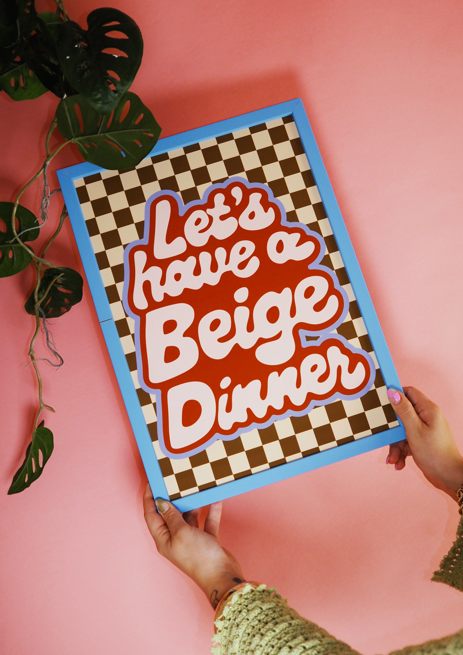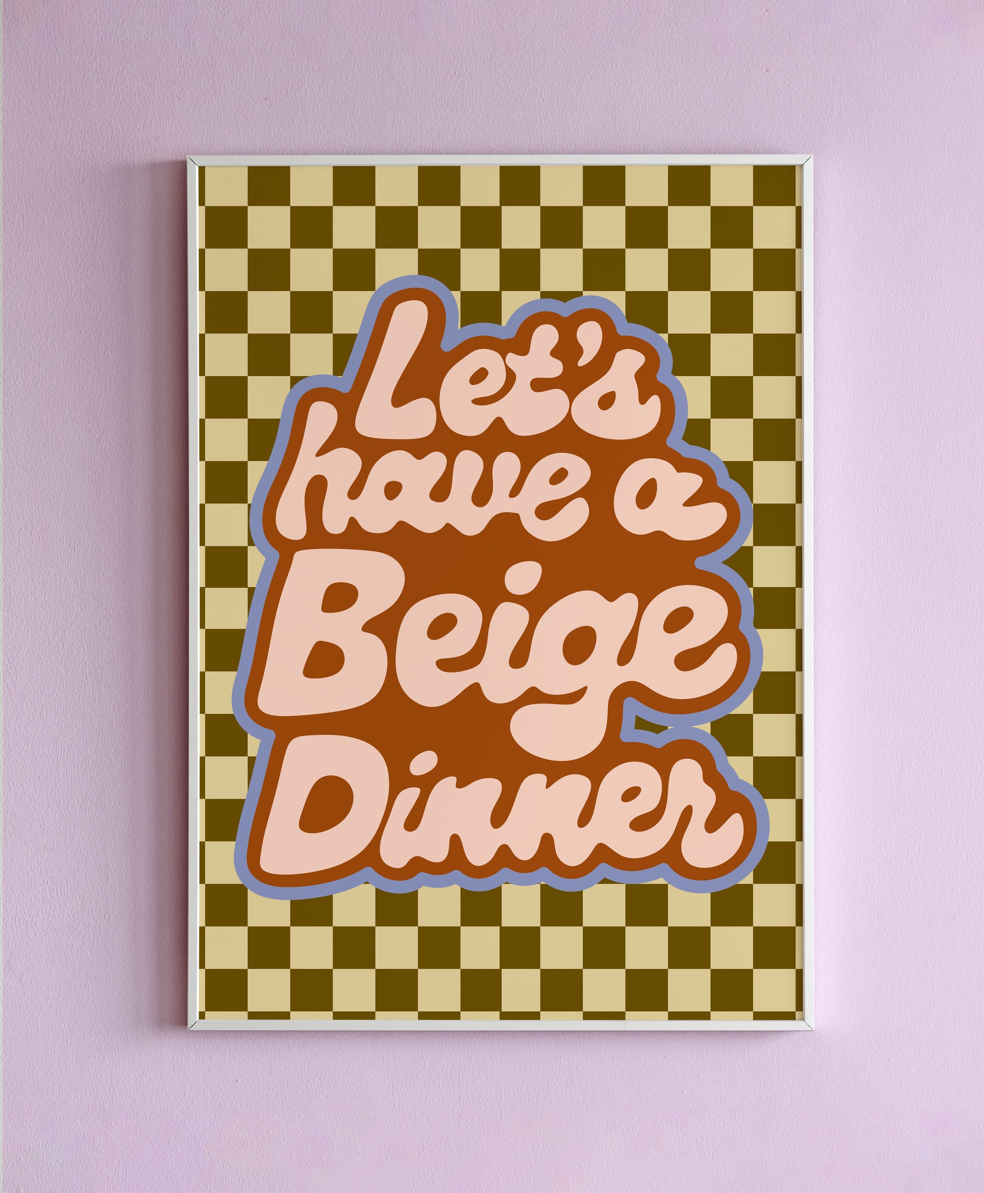 Embrace the joy of effortless meals with the playful "Let's Have A Beige Dinner" wall print. Perfectly capturing the spirit of freezer tapas and those nights you just can’t be arsed to cook, this fun design adds a cheeky touch to your kitchen or dining space.