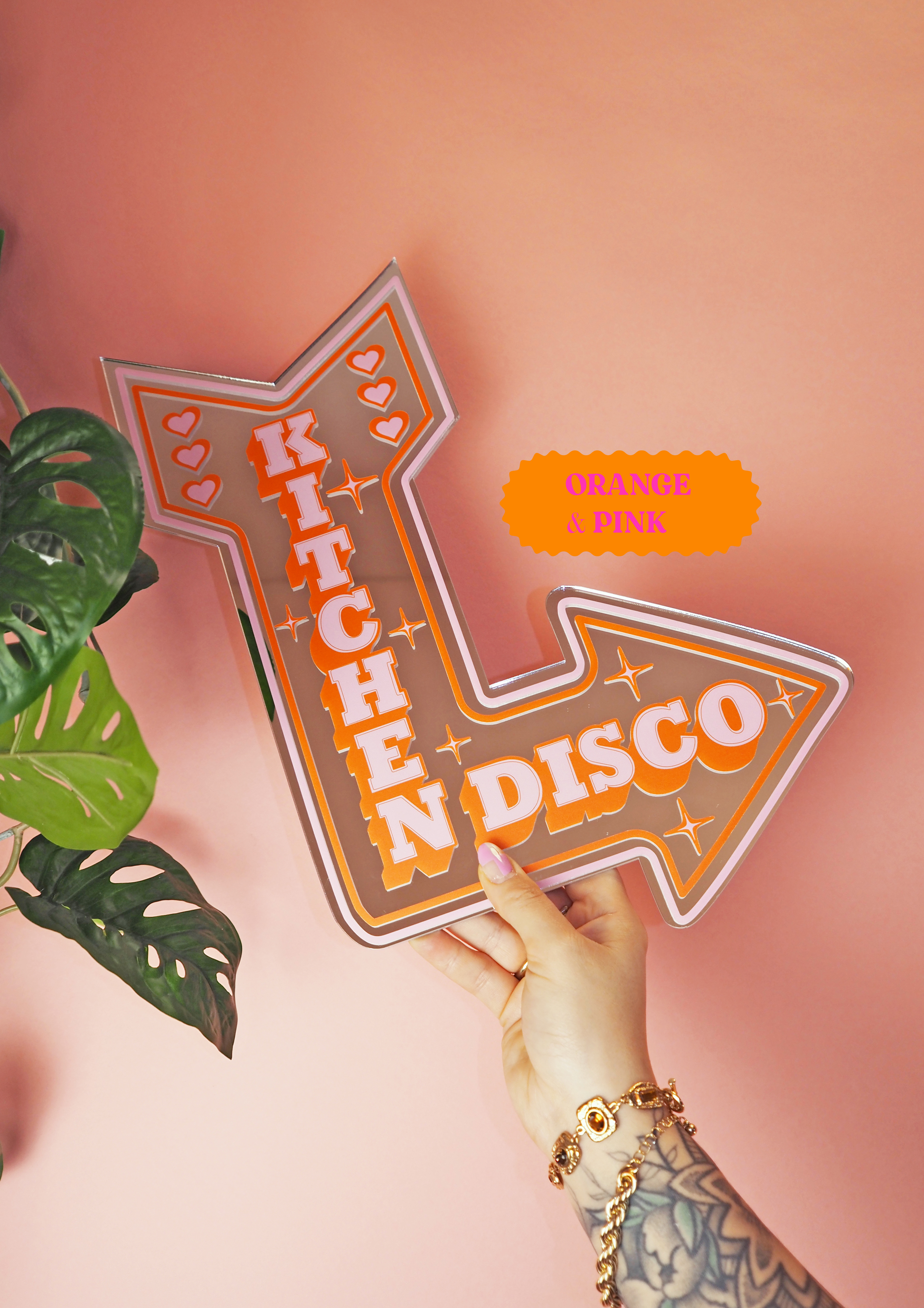 Add a touch of nostalgia and quirkiness to your home with our retro kitchen arrow mirror, available in two sizes. Featuring a neon sign-inspired design with a playful arrow shape in pink & orange, it's a fun addition to any room. Inspired by the bright neon lights of Vegas!
