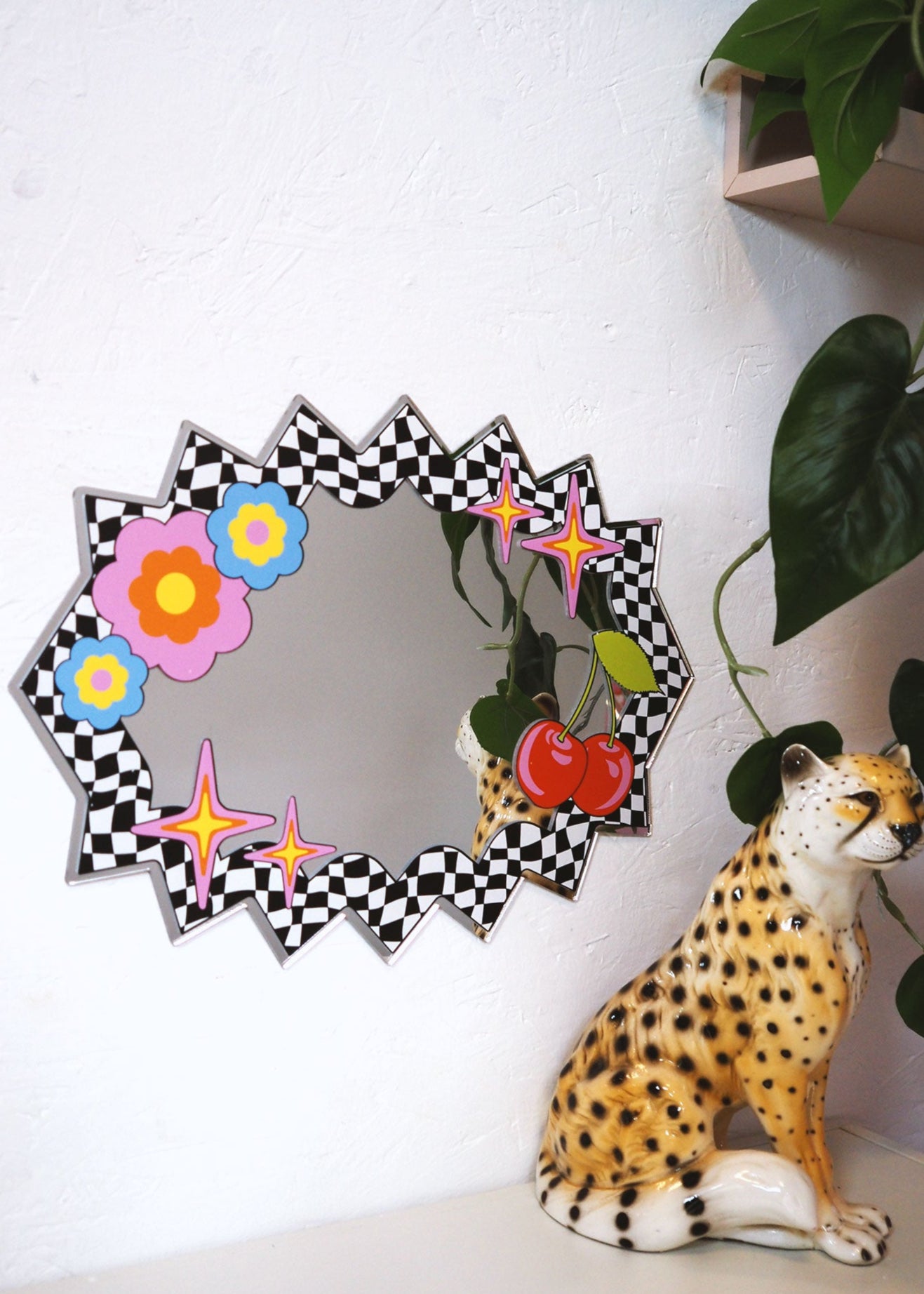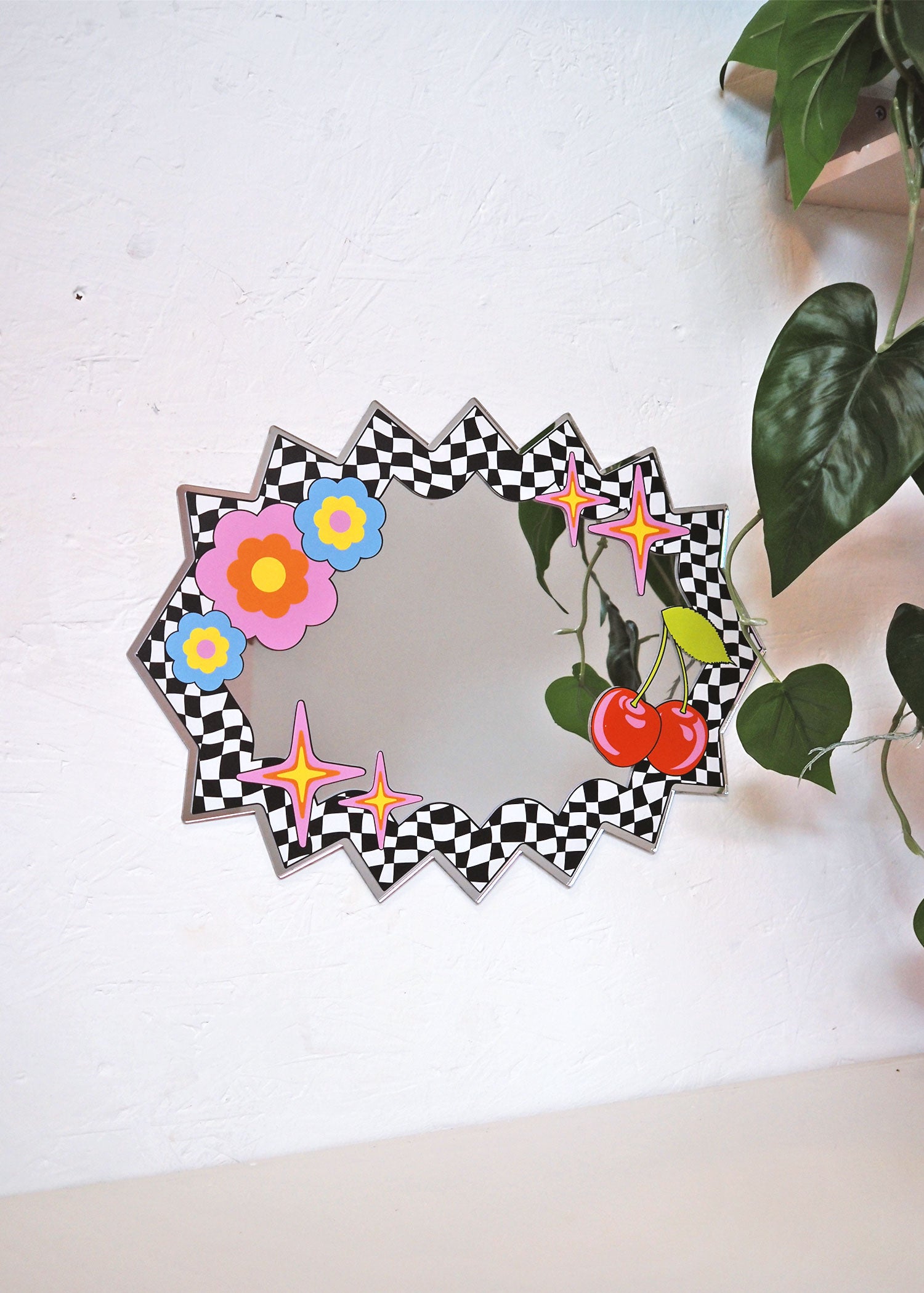 The Bang Blob Mirror brings a playful twist to your space with its spikey blob shape and bold black-and-white checkerboard pattern. Adorned with cherries, stars, and flowers around the edges, this funky, maximalist piece adds vibrant energy and a cool, quirky vibe to any room. Perfect for those who want decor that’s anything but boring.