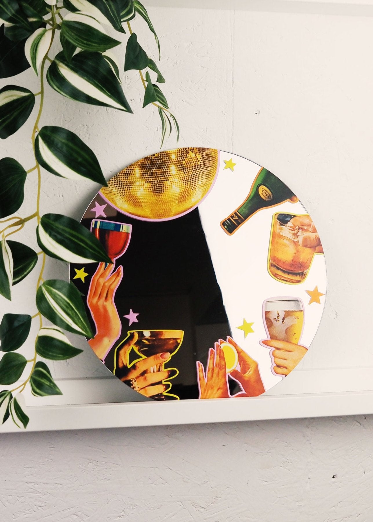Take a fabulous selfie with the cheers to me mirror! The vintage collage cocktail design adds a retro and fun vibe to your wall or dressing table. Get ready to say "cheers" to yourself in style!