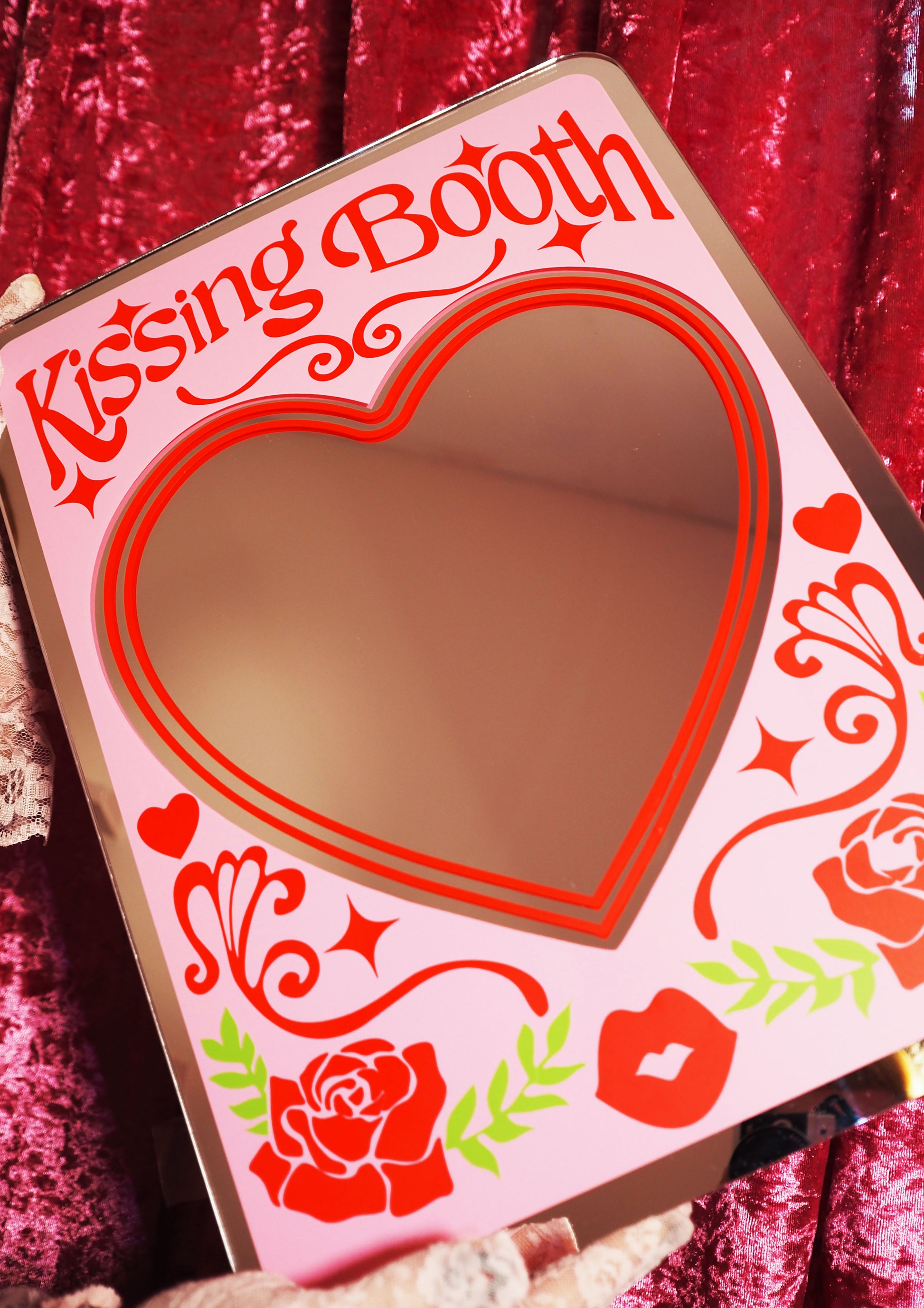 Pucker up and check yourself out in this vintage-inspired Kissing Booth Mirror. Splashed with retro roses and cheeky Vegas style text, it's the ultimate kitschy wall décor for your boudoir! Whether you're getting ready for a night out or just want to admire your best self, this bold, flirty mirror brings nostalgic charm and humour to any room.