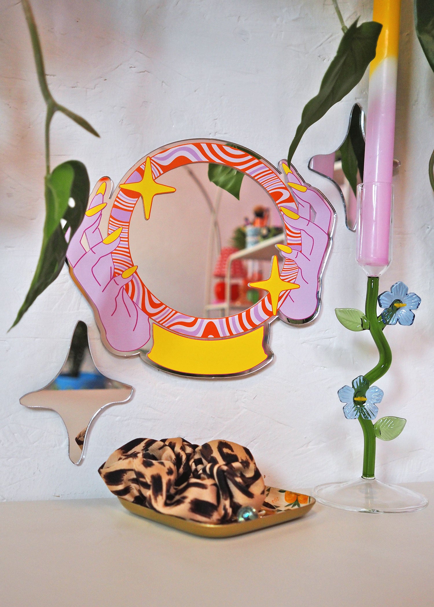 Add a magical touch of retro glamour to your home with our Magic Crystal Ball Mirror, featuring a swirly retro pattern in yellows & pinks. This fun crystal ball-shaped mirror brings cosmic vibes and positive energy to any room. My reflection never looked so magical! Perfect for bedrooms, dressing tables or statement walls.