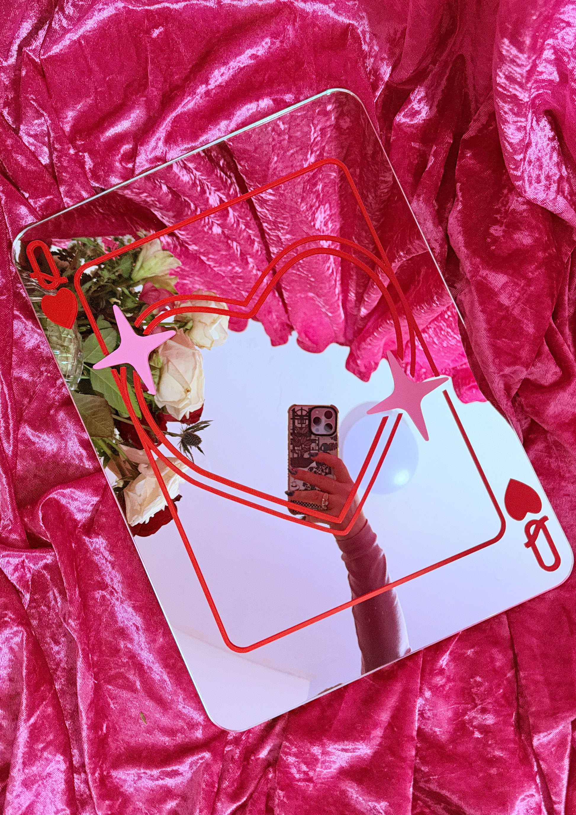 Add a touch of classic elegance with a kitsch twist to your walls with our Queen of Hearts mirror. Shaped like a playing card and featuring a simple pink and red design, it’s perfect as a vanity mirror or dopamine piece for your walls, who said mirrors need to be boring!