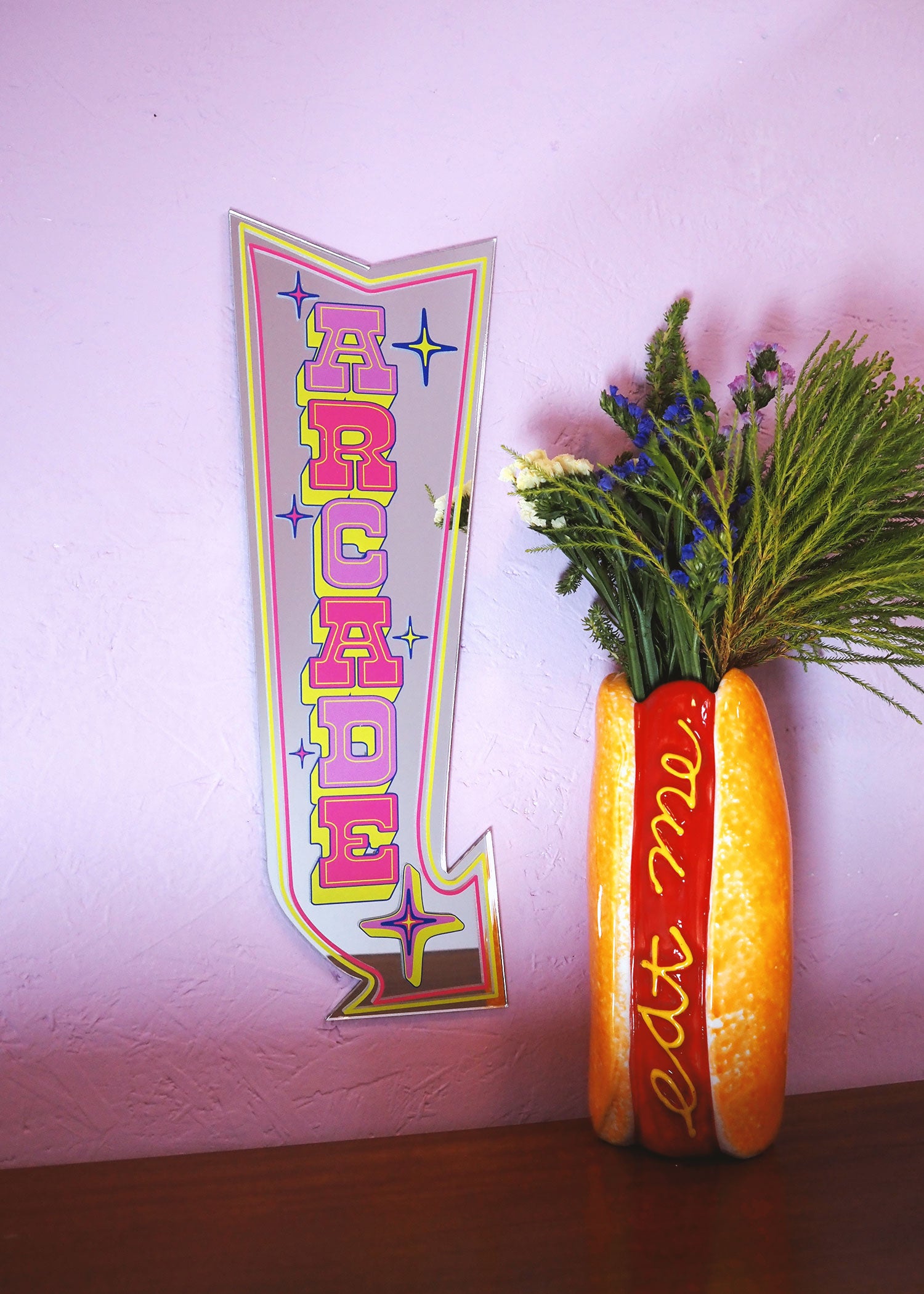 Level up your wall space with our Retro Arcade Arrow Mirror, a bold and playful nod to nostaligic arcade signage. This arrow-shaped mirror features vibrant green and pink retro colours and classic vintage typography, inspired by iconic arcade neon signs. Let's bring  vintage gaming vibes straight to your walls.