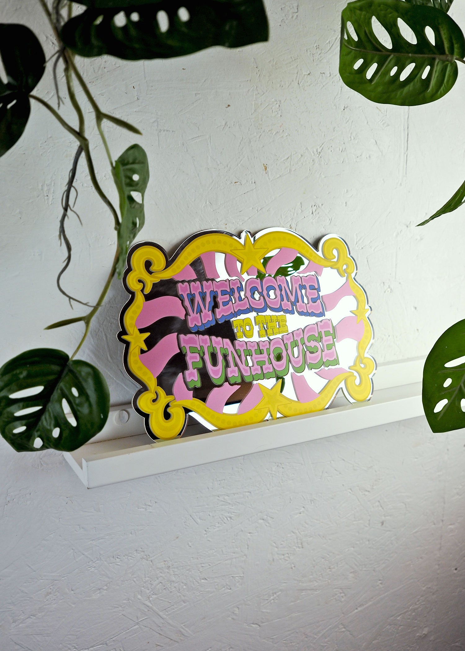 Step right up and add a splash of vintage carnival charm to your space with our Welcome to the Funhouse Mirror! This eye-catching mirror is shaped like a classic funhouse sign, featuring bold retro colors and playful typography that instantly brighten up any room.  Choose between 2 different colourways - pink & orange or lilac and green!